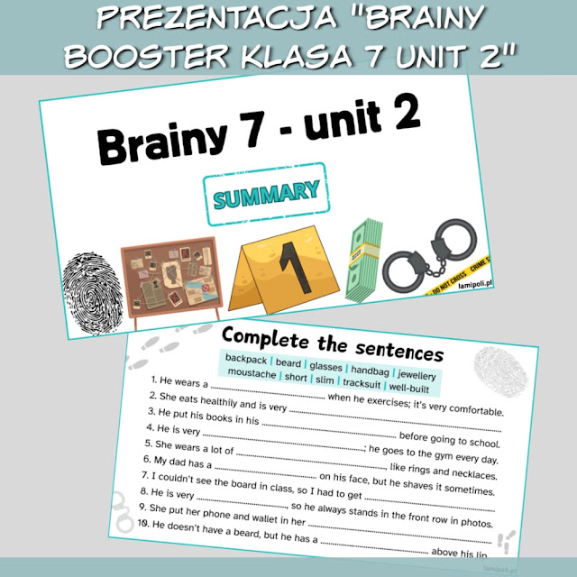 Zestaw Brainy Booster klasa 7 Unit 2 ze sklepu lamipoli.pl to gotowy zbiór materiałów edukacyjnych, który wspiera uczniów w powtórce zagadnień z drugiego unitu podręcznika Brainy 7. W pakiecie znajduje się prezentacja z różnorodnymi zadaniami na słownictwo, gramatykę oraz speaking, a także karty pracy, które można wykorzystać jako test lub materiały dla uczniów szybciej kończących zadania.